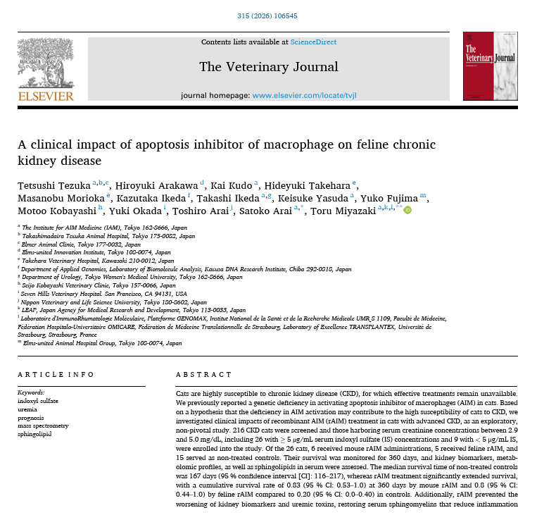 Tezuka T, Arakawa H, Kudo K, Takehara H, Morioka M, Ikeda K, Ikeda T, Yasuda K, Fujima Y, Kobayashi M, Okada Y, Arai T, Arai S, Miyazaki T. A clinical impact of apoptosis inhibitor of macrophage on feline chronic kidney disease. https://doi.org/10.1016/j.tvjl.2026.106545
